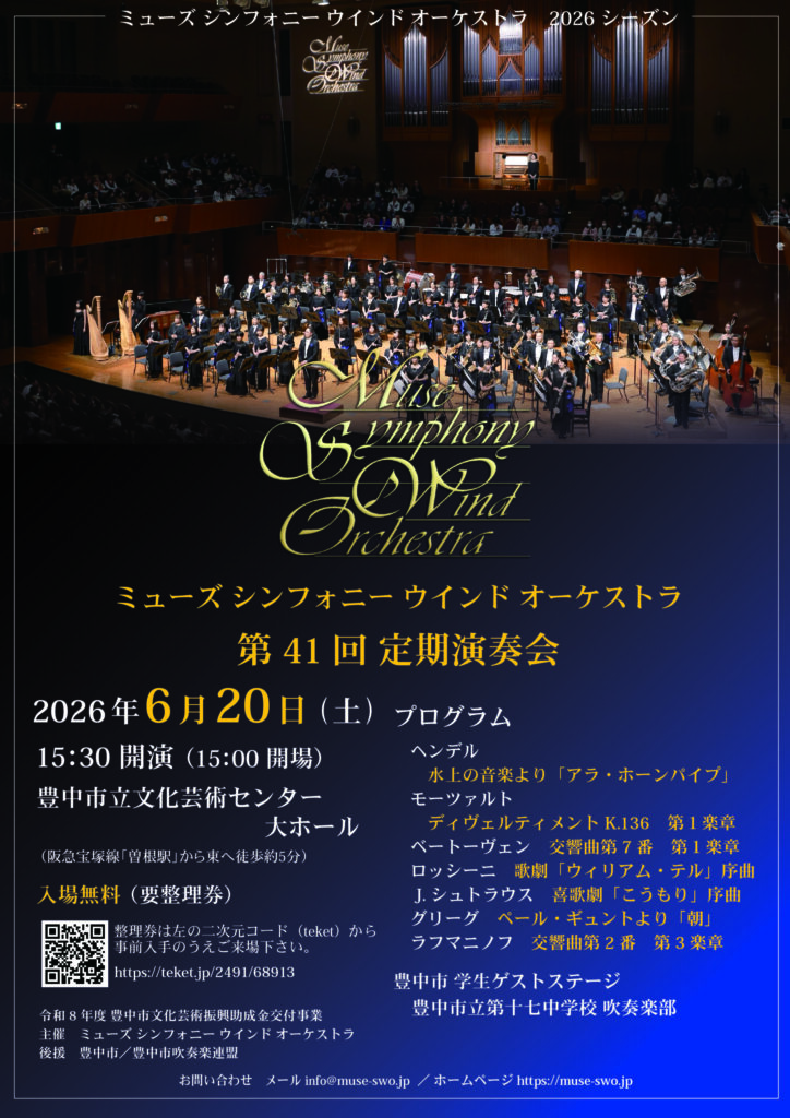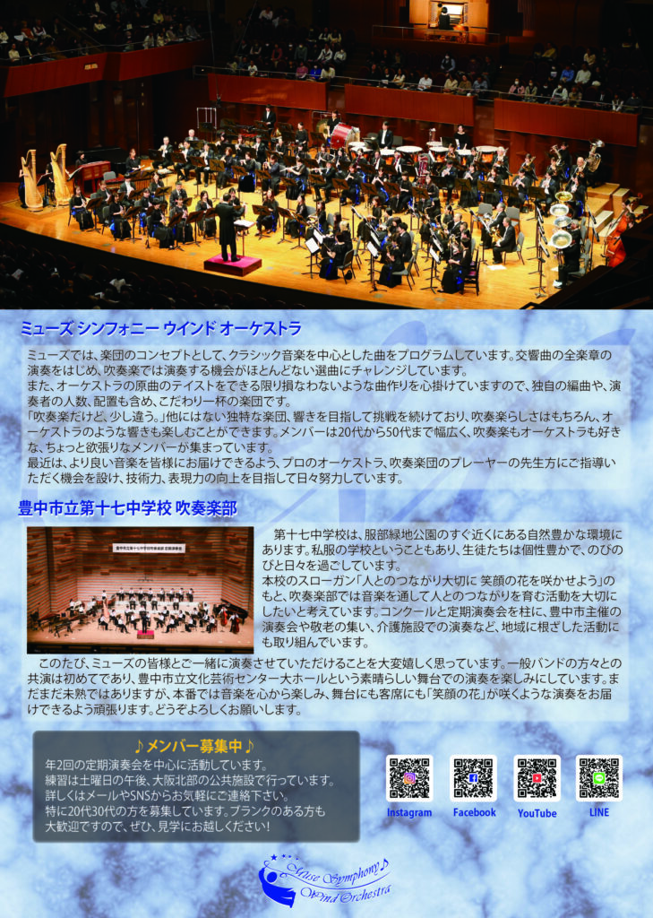 ミューズ シンフォニー ウインド オーケストラ は大阪の豊中市、吹田市など、北摂エリアを中心に活動するアマチュア吹奏楽団です。